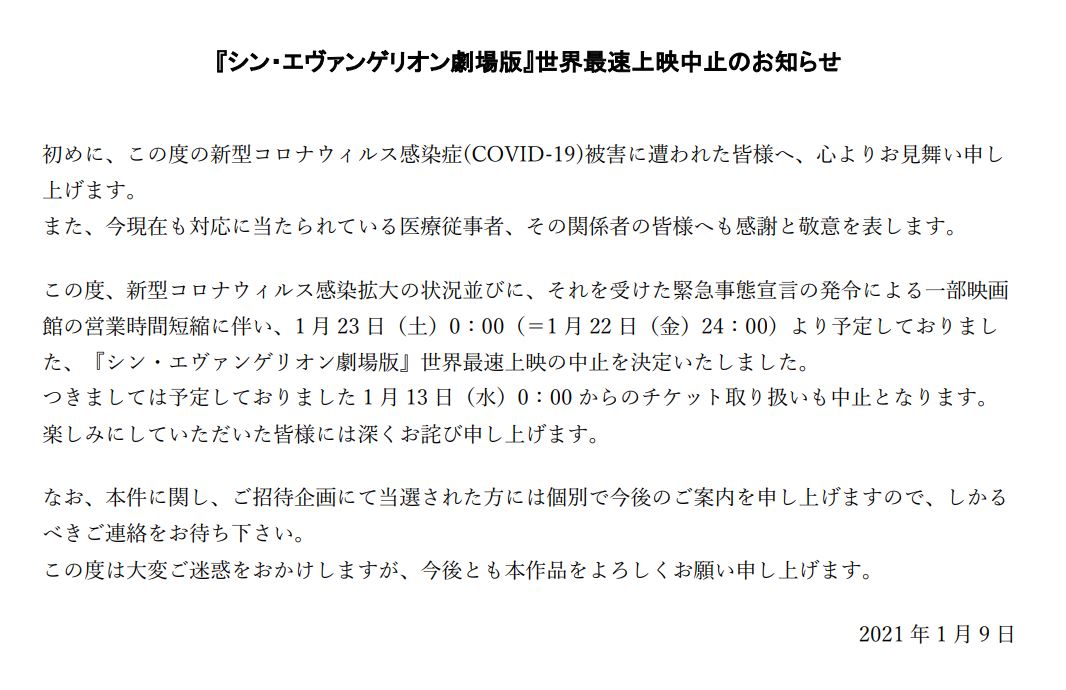 개최될 예정이었던 '신 에반게리온 극장판' 세계 최속 상영이 중지된