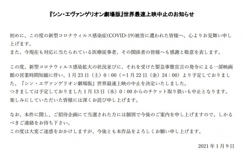 신 에반게리온 극장판, 세계 최속 상영 중지 발표