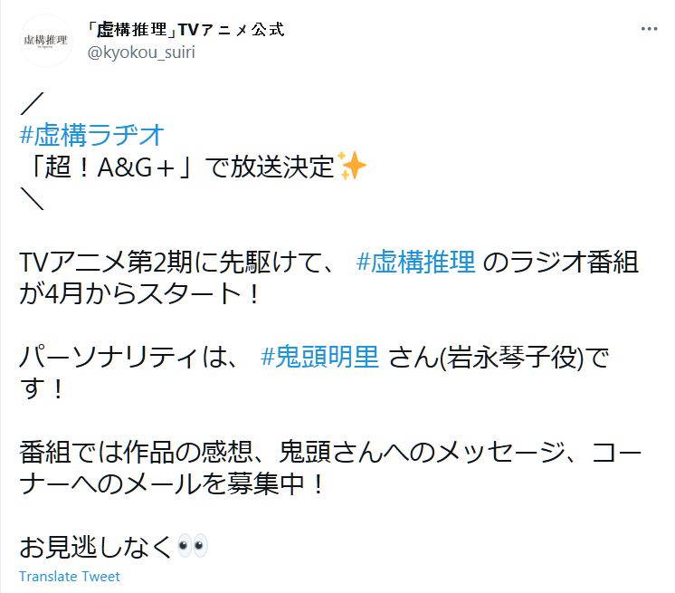 TV 애니메이션 '허구추리'의 라디오 프로그램이 2021년 4월부터 월 1회 방송 예정