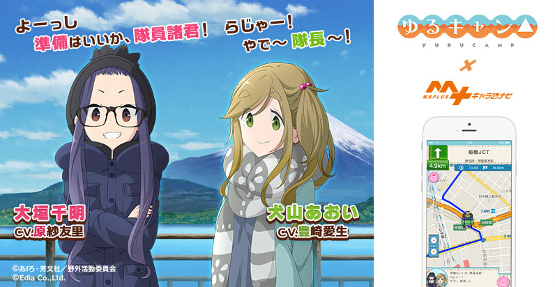 내비게이션 앱 'MAPLUS 캐러de내비'에, TV 애니메이션 '유루캠프'의 치아키와 아오이 추가