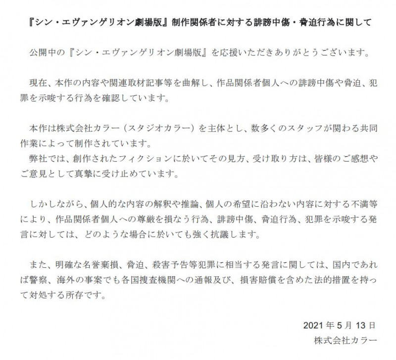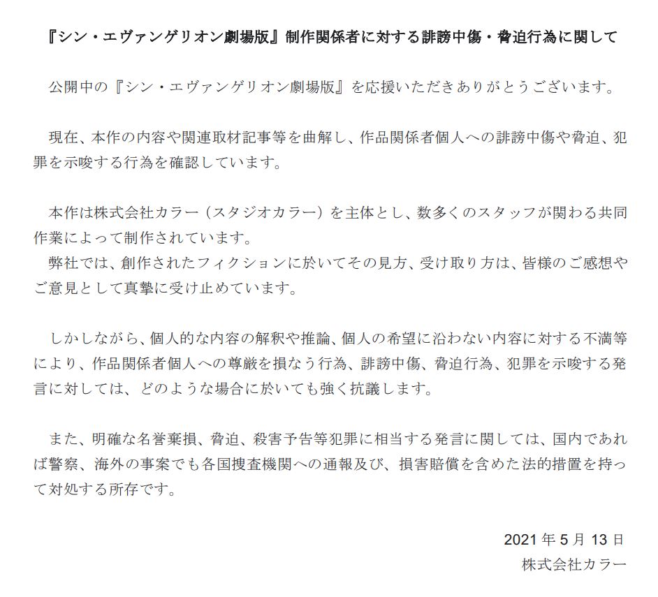 스튜디오 카라, 신 에반게리온 극장판 제작 관계자에 대한 비방 중상에 강하게 항의하는 입장문 발표