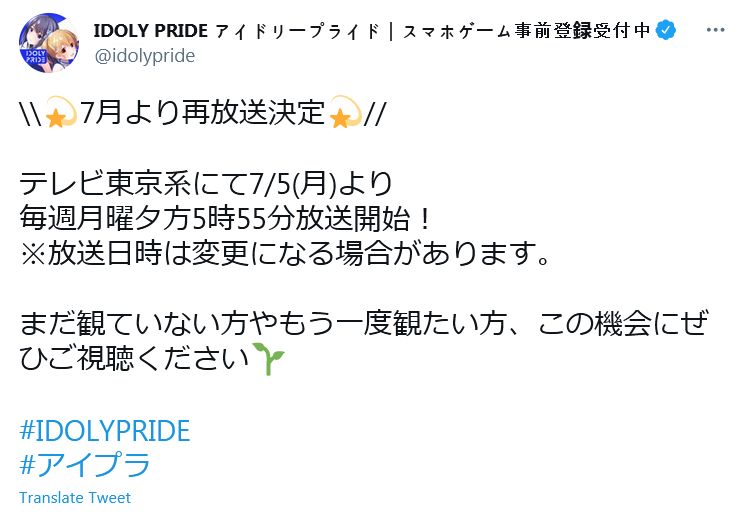 TV 애니메이션 'IDOLY PRIDE'가 TV 도쿄계에서 2021년 7월 5일부터 재방송