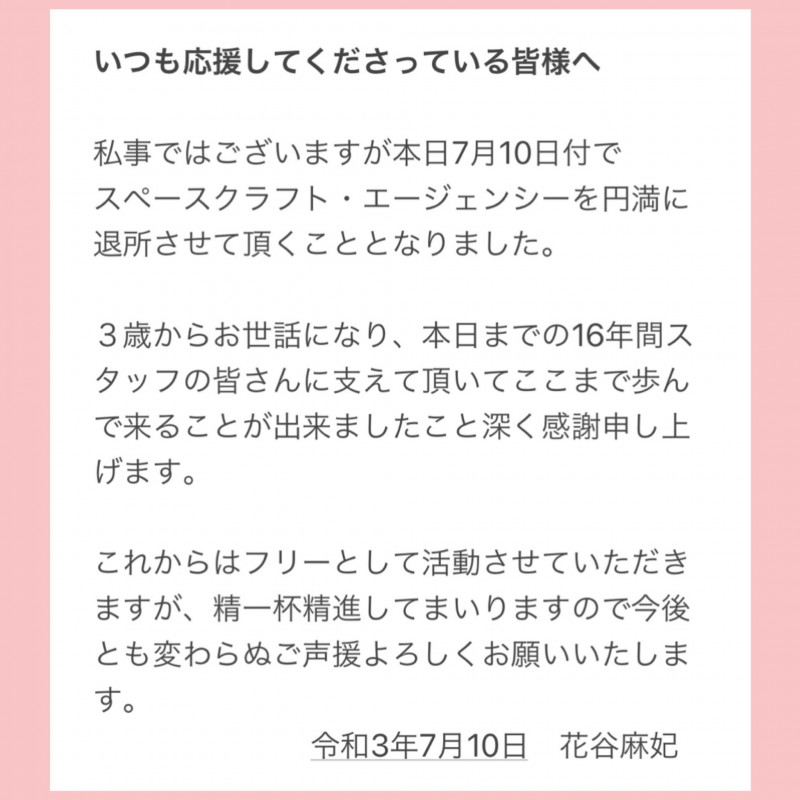 성우 하나타니 마키, 2021년 7월 10일자로 '스페이스 크래프트'를 퇴사하여 프리랜서로 활동