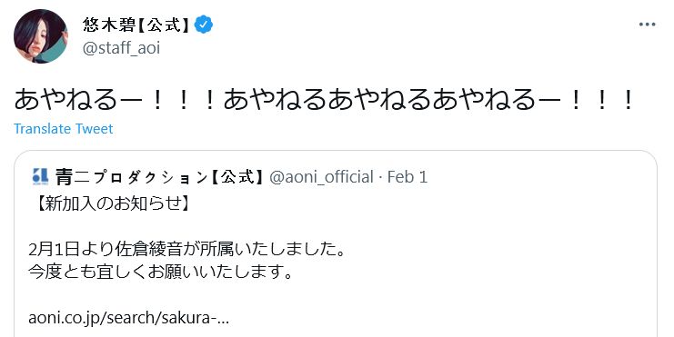 한 사쿠라 아야네가 2022년 2월 1일자로 (유우키 아오이와 같은)