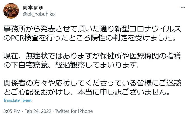 오카모토 노부히코 본인도 트위터에 올린 글을 통해서, 지금은