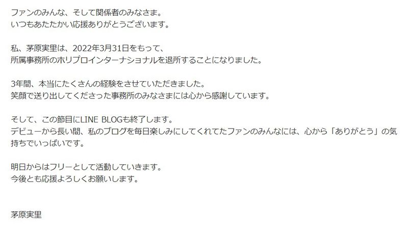 하여, 3월 31일자로 소속 사무소인 '호리프로 인터내셔널'을 퇴사하고,