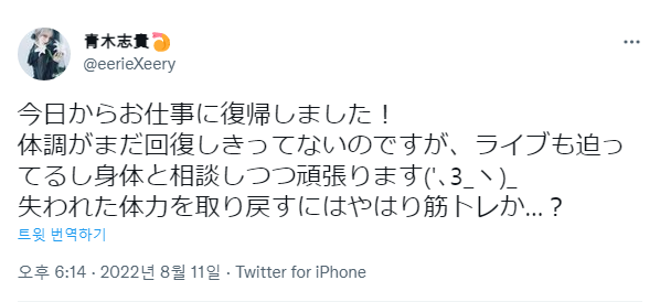 nobucae 성우 아오키 시키가 2022년 8월 11일 활동 재개, 코로나 감염에서 복귀 [성우] 작성일시 : 2022. 08. 12 (00:32) 조회 : 1,851 / 댓글 : 0 성우 아오키 시키가 2022년 8월 11일, 자신의 트위터에서 신종 코로나 바이러스 감염에서 복귀했다는 사실을 보고입니다.컨디션은 아직 회복되지 않았지만 다시 재개해, 열심히 하겠다고 합니다. 출처(링크) : https://twitter.com/eerieXeery/status/1557656603792326658 4추천 글쓰기스크랩 신고