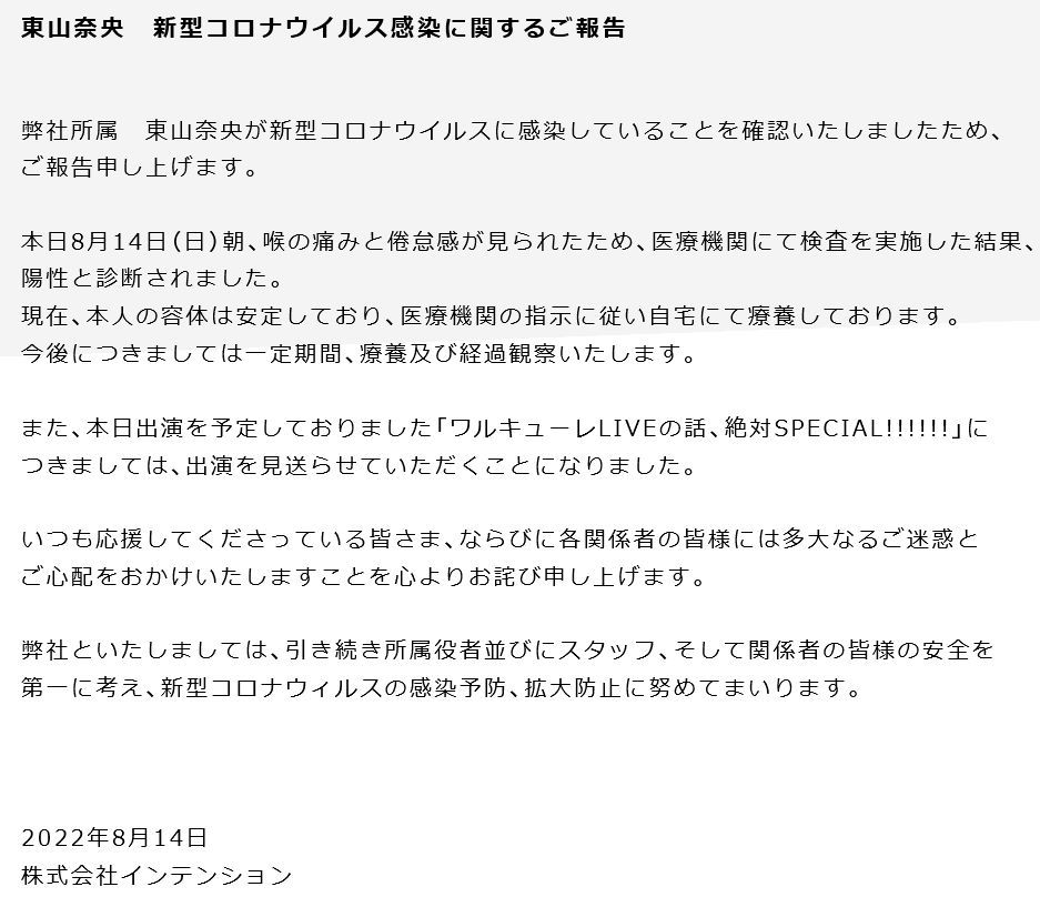 소속 사무소의 공지에 따르면, 2022년 8월 14일 아침, 목 통증과 권태감