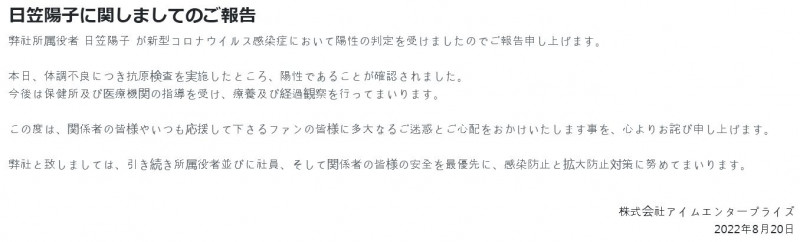 성우 히카사 요코, 신종 코로나 바이러스 양성 판정