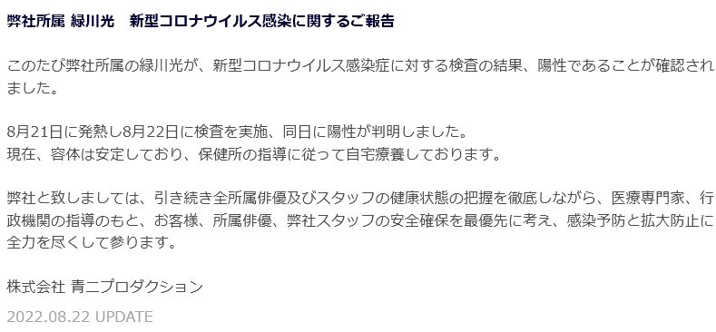 성우 미도리카와 히카루씨가 신종 코로나 바이러스에 감염되었다