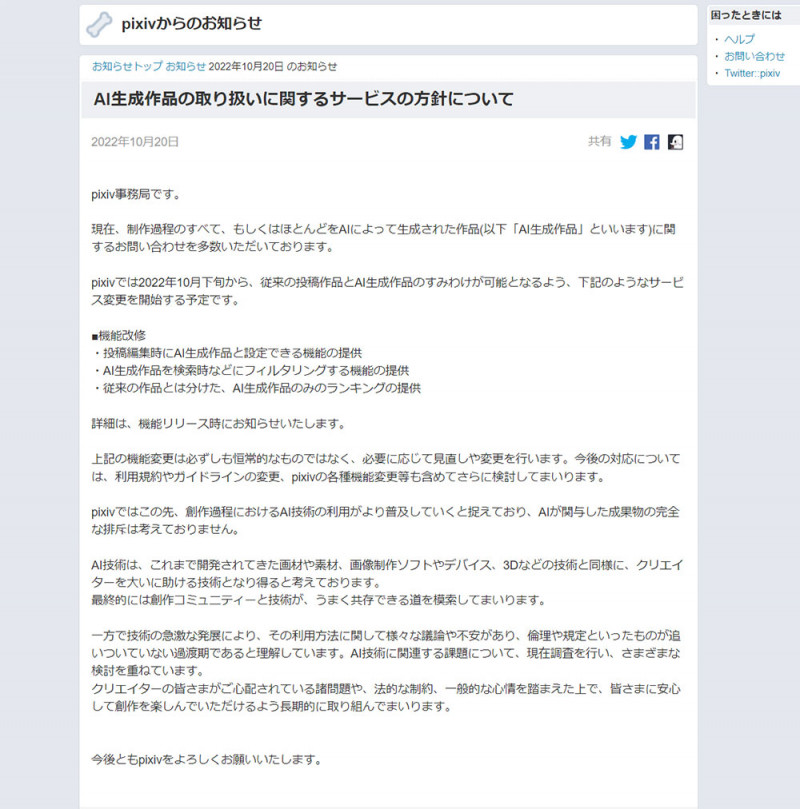 일본의 픽시브가 2022년 10월 20일, 인공지능(AI)이 생성한 일러스트
