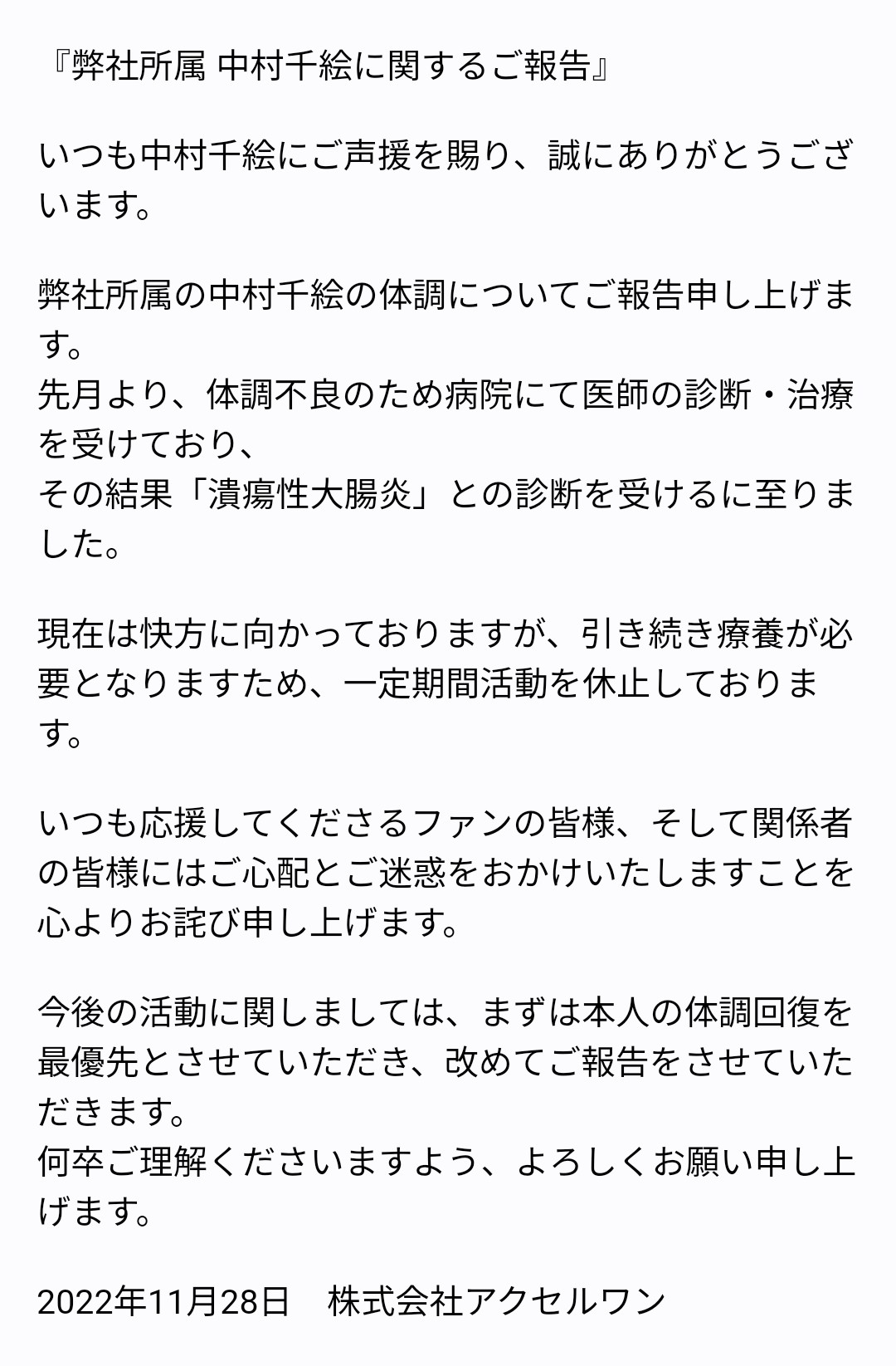 성우 나카무라 치에, 궤양성 대장염으로 인해 일정 기간 활동을 쉬면서 요양할 계획
