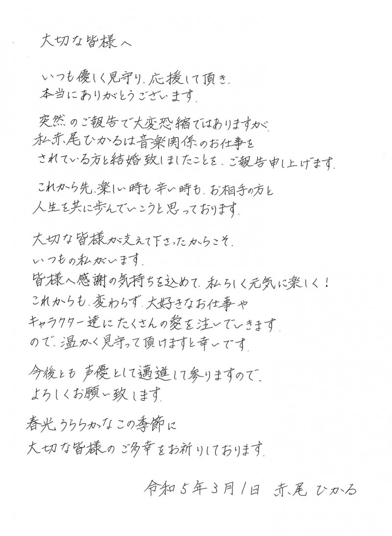 성우 아카오 히카루가, 2023년 3월 1일, 자신의 트위터에서 결혼 발표