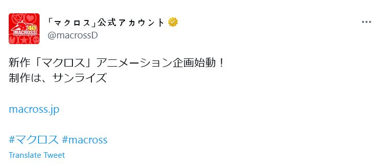 마크로스 시리즈의 신작 애니메이션 기획 시동, 선라이즈 제작 담당
