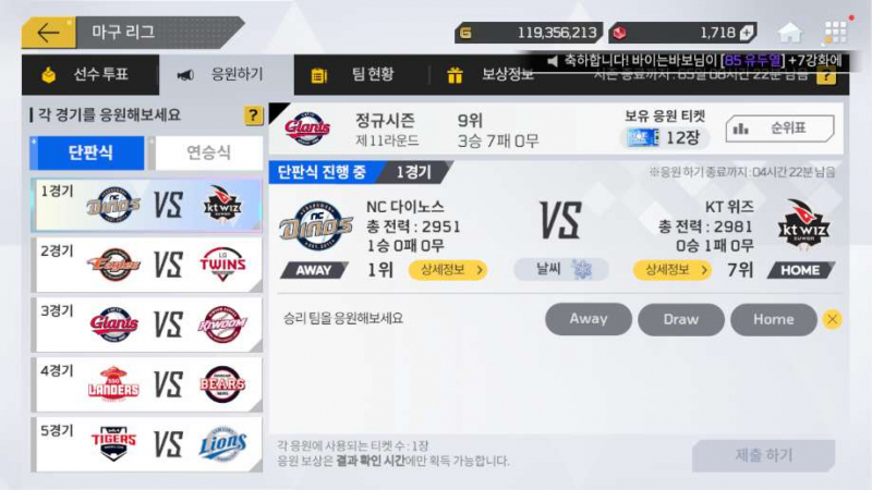 또 최근에 마구 리그라고 승부 예측 게임 모드가