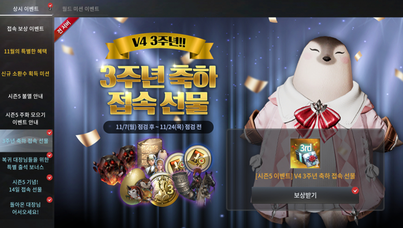 3주년 축하 선물로 희귀, 영웅 수집 증표,. 영웅 탈것 , 소환수, 동료 계약서까지