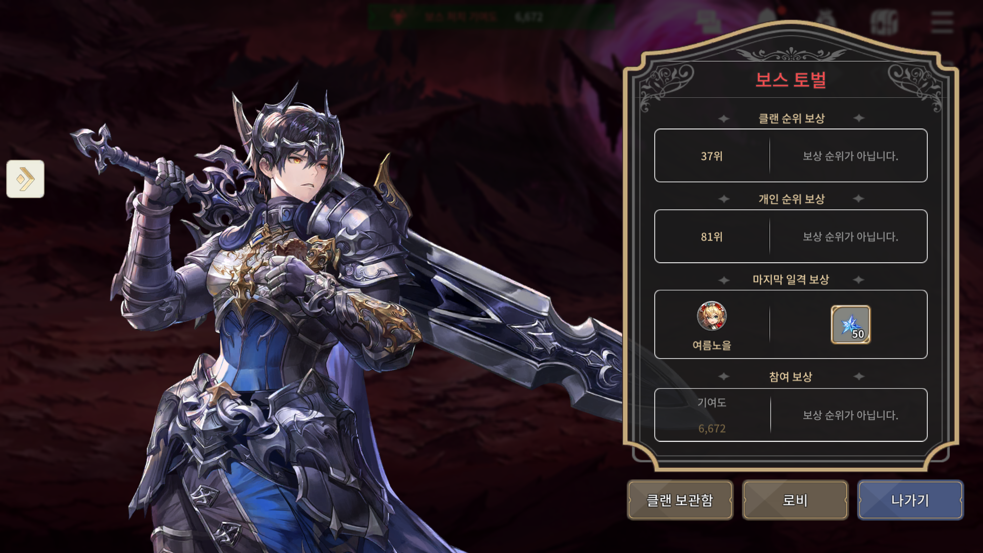 그러면 이렇게 클랜 순위 보상과 개인 순위 보상, 마지막 일격 보상, 참여 보상 등