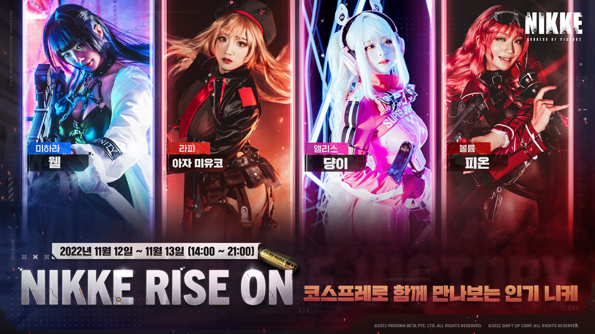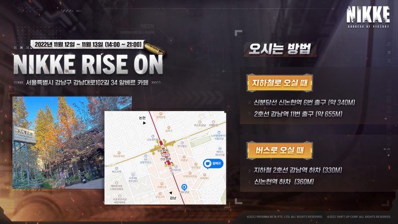 코지마마코 승리의여신 니케 카페 이벤트 해요 작성일시 : 2022. 11. 11 (16:45) 조회 : 656 / 댓글 : 1 승리의 여신 니케 오프라인 카페 이벤트 진행해요강남에서 진행하고 11월 12일부터 13일까지만 한다고 해요 정확한 공지 보니까 실제 총기 구현도 하고 니케 코스프레 한 코스어들도 볼 수 있대요뿐만 아니라 여러 굿즈도 현장에서 볼 수 있다고 해서저도 시간 될 때 들러서 구경 해볼까 하고 있어요 ㅋㅋㅋ 2추천 글쓰기스크랩 신고