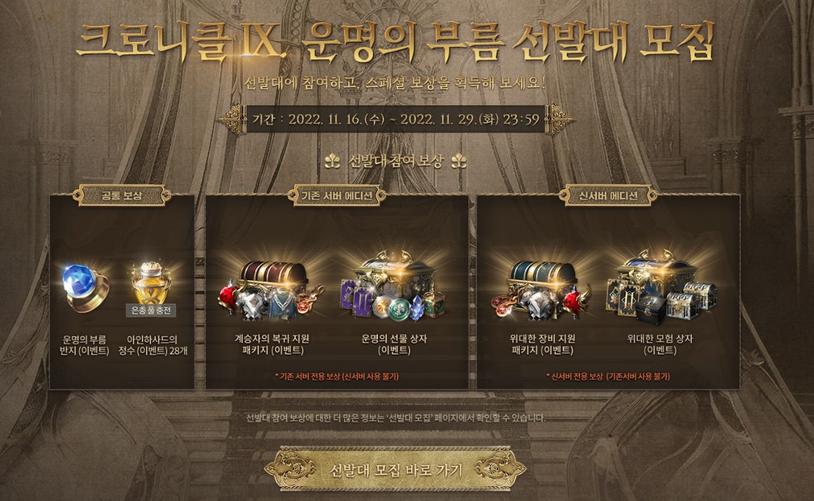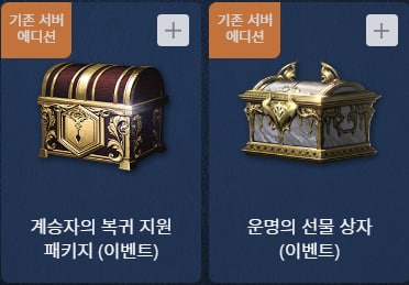그리고 기존 서버 에디션 쿠폰 보상으로는 계승자의 희귀 장비 지원 상자 (이벤트) 1개, 계승자의 장신구 지원 상자 (이벤트) 1개가 포함되어 있는 계승자의 복귀 지원 패키지 (이벤트)를, 그리고 마스터 클래스 획득권(11회) (각인) 1개, 마스터 아가시온 획득권(11회) (각인) 1개, 최상급 클래스 획득권(11회) (각인) 5개, 최상급 아가시온 획득권(11회) (각인) 5개, 상급 각성의 물약 (각인) 10개, 명예의 훈장, 신탁의 증표, 결졍체 (각인) 각 333,333개가 포함되어 있는 운명의 선물 상자를 지급합니다.