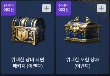 다음으로 신서버 에디션 쿠폰 보상으로는 위대한 무기 지원 상자 (이벤트) 1개, 위대한 방어구 지원 상자 (이벤트) 1개, 위대한 장신구 지원 상자(이벤트) 1개가 포함되어 있는 위대한 장비 지원 패키지 (이벤트)를 지급하며 위대한 모험 보급품 (이벤트) 1개, 빛나는 무기 강화 주문서 상자 (각인) 30개, 빛나는 방어구 강화 주문서 상자 (각인) 30개, 상급 클래스 획득권(11회) (각인) 5개, 상급 아가시온 획득권(11회) (각인) 5개가 포함되어 있는 위대한 모험 상자 (이벤트)를 지급한다고 합니다.