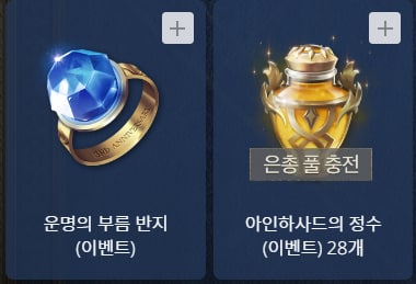 먼저 공통 보상의 경우 착용시 방어력 +3, 명중 +3을 올려주고 컬렉션 등록 시 방어력 +1, 은총 충전량 증가 +3%를 늘려주는 운명의 부름 반지 (이벤트)와 아인하사드의 정수 (이벤트) 28개를 지급할 예정입니다.