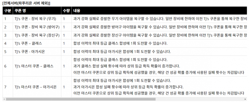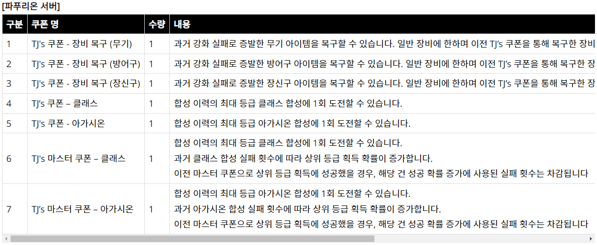 그리고 신규 서버인 파푸리온 서버에 해당하는 TJ`s 쿠폰 입니다