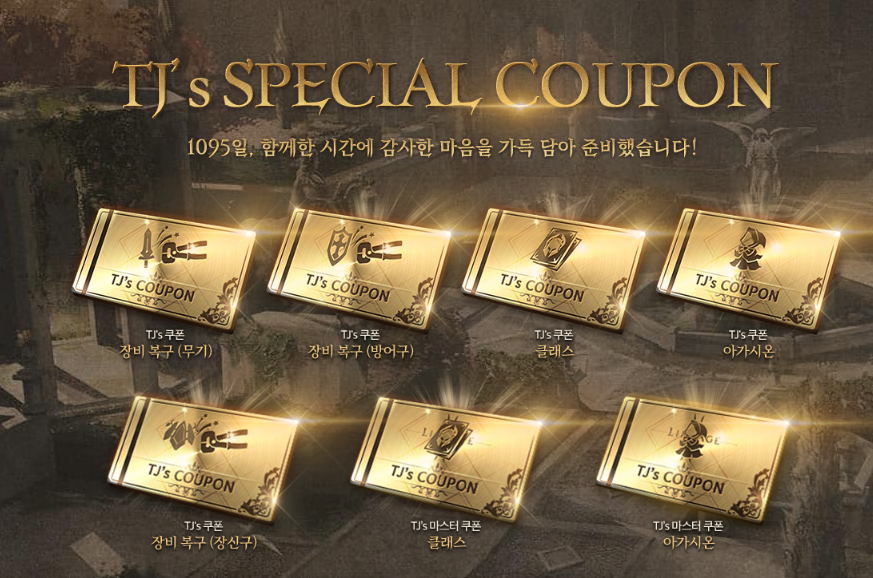리니지2M 운명의 부름 업데이트로 공개된 TJ쿠폰입니다.