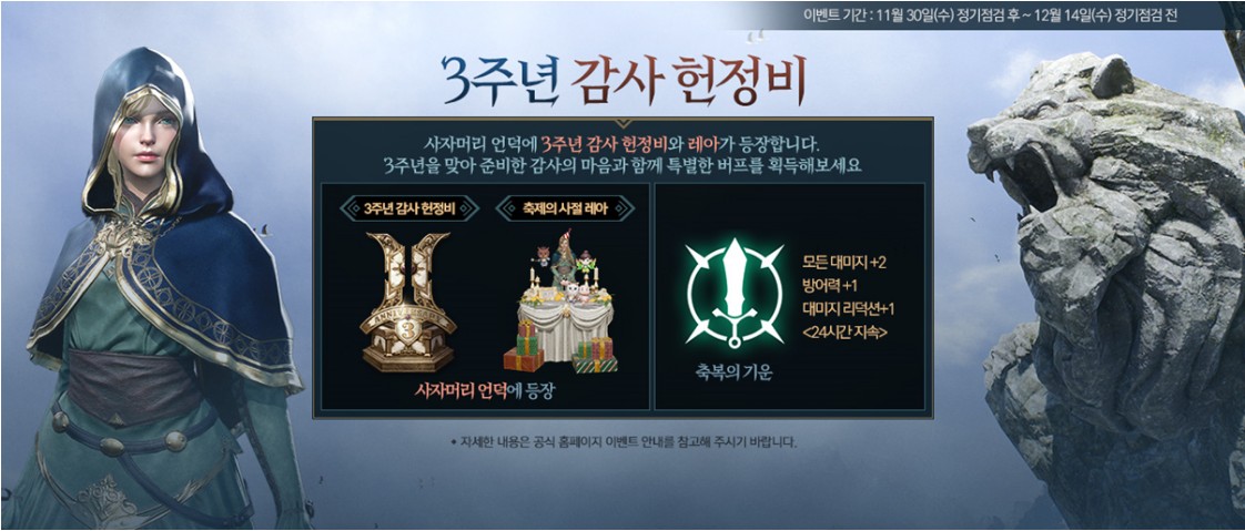 - 이벤트 기간 동안 사자머리 언덕 옆 은총의 절벽에 <3주년 감사 헌정비>와 <축제의 사절 레아>가 등장합니다.