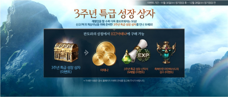- 이벤트 기간 동안 <3주년 특급 성장 상자 (10레벨) (이벤트)> 다이아 상점 → 교환소 → <판도라의 상점> 에서 탭에서 1127 아데나에 구매할 수 있습니다.
