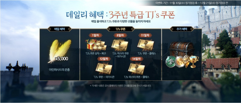 - 데일리 혜택 <3주년 특급 TJ’s 쿠폰>은 운명의 부름 주화 (이벤트)를 사용하여 오픈할 수 있습니다.
