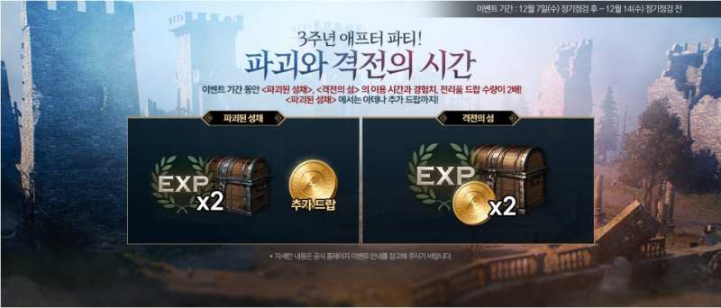 3. <파괴된 성채><격전의 섬> 사냥 시, 경험치와 보상 상자를 2배 획득할 수 있습니다.
