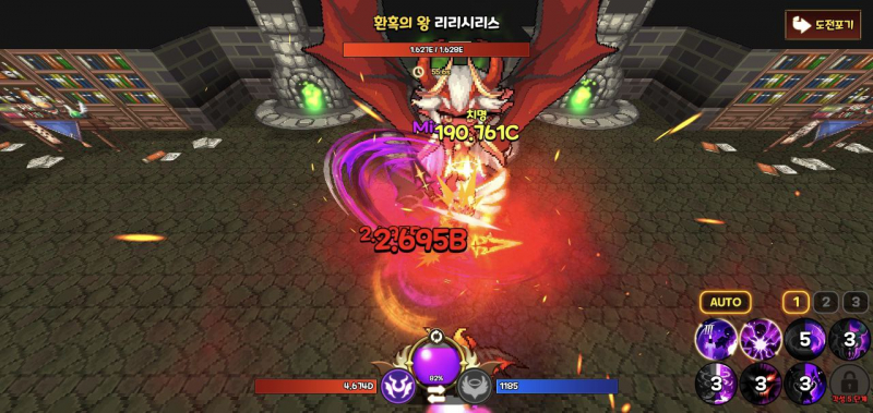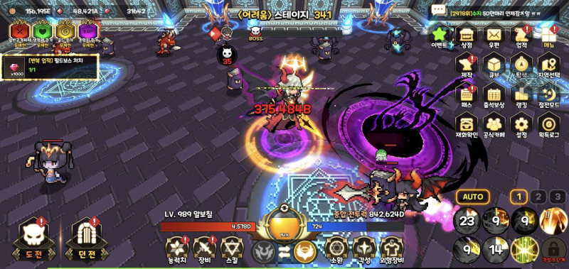 접속 시 던전 도전 콘텐츠를 밀어주거나 모은 재화들로 강화를 시켜주면 되는 간단한 조작 방식 입니다.
