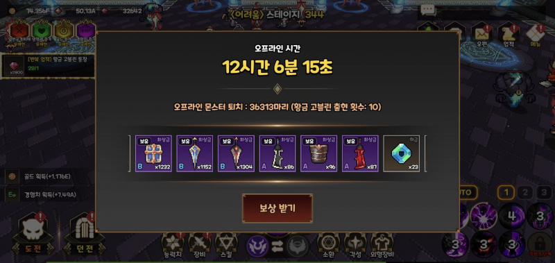방치형게임 답게 오프라인으로도 보상획득이 가능하기 때문에 위 사진처럼 보상들을 챙길수 있고