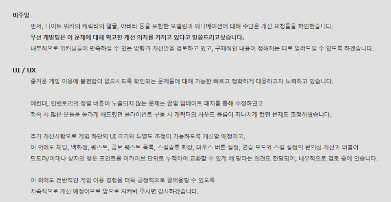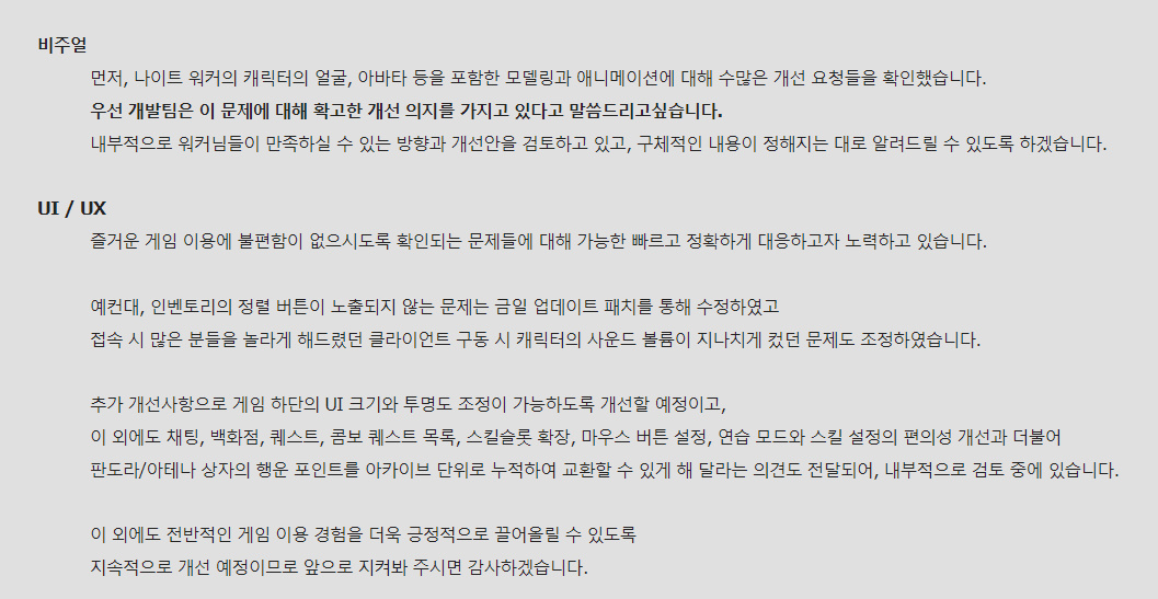 꾸쀼쀼 나이트 워커 피드백도 빠르고 작성일시 : 2023. 02. 07 (15:58) 조회 : 541 / 댓글 : 1 나이트 워커 저번 개발자편지 좀 감동이었던 듯...저도 유저지만 플레이 하면서 개선할 게 있었다곤 생각했거든요그거 하나하나 짚고 개선 방향에 대해서도 언급해서약간 감동했잖아요 ㅋㅋㅋ 개발자 편지 뜨고나서 보상으로 프리셋 확장권도 하나 줘서 개이득 ㅋ안 그래도 확장권 필요했는데 대만족 ㅎ 1추천 글쓰기스크랩 신고