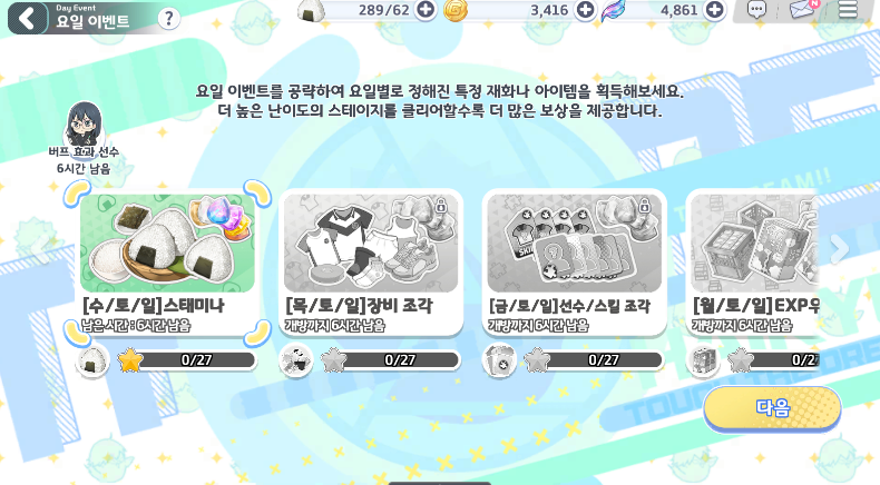 페녹시 하이큐 콘텐츠 추가됐어요 작성일시 : 2023. 02. 15 (17:22) 조회 : 465 / 댓글 : 1 이제 요일별로 스태미나/장비조각/스킬조각 등얻을 수 있는 콘텐츠 추가됐어요시간대 별로 열리는거같은데잘챙겨야할듯스테이지 계속 밀어주고 있는데이제 어느정도 나가는 멤버들 정해져서스테이지 스킵티켓으로 장비들 좀 얻어야겠어요 ㅋㅋ 2추천 글쓰기스크랩 신고