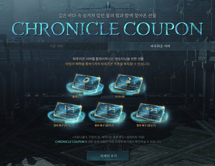 이번 쿠폰 종류는 크게 두가지(크로니클 쿠폰 / 파푸리온 쿠폰)이고, 서버에 따라 나뉘게 됩니다