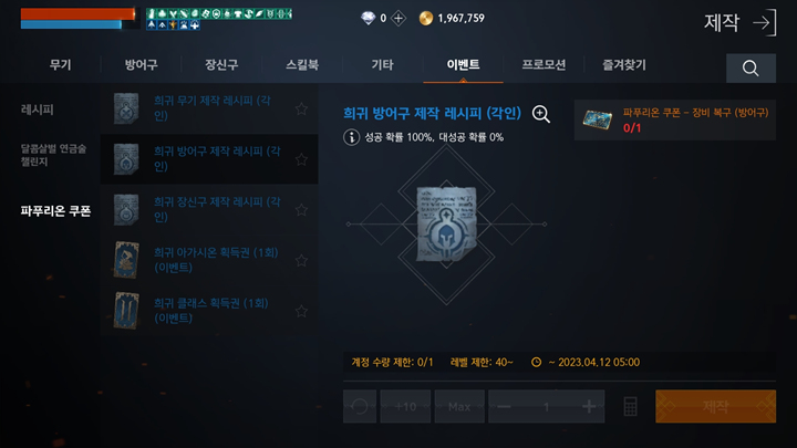 파푸리온 쿠폰 - 장비 복구(방어구) = 희귀 방어구 제작 레시피