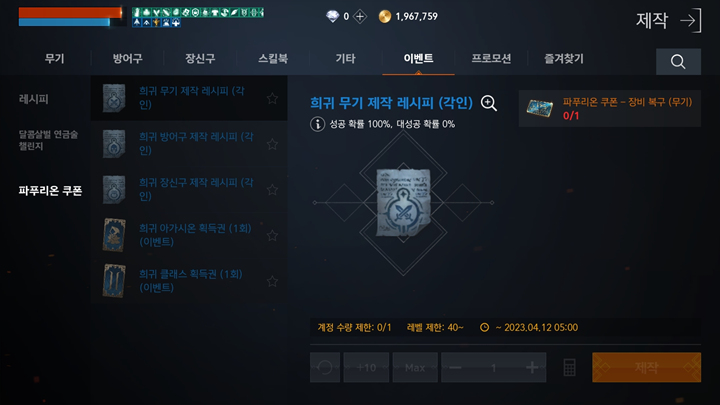파푸리온 쿠폰 - 장비 복구(무기) = 희귀 무기 제작 레시피