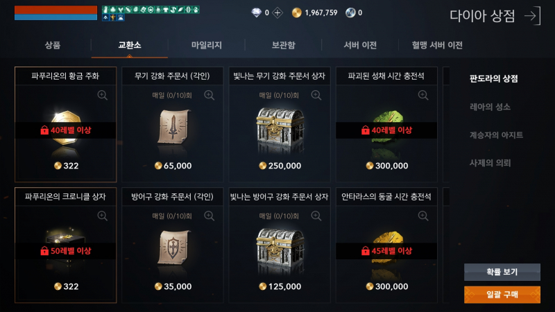 레벨 제한의 경우 65레벨 이상부터 가능하다는 차이가 있습니다