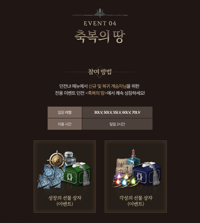 축복의 땅에선 다량의 경험치와 아데나는 물론, 성장의 선물 상자와 각성의 선물 상자를 통해