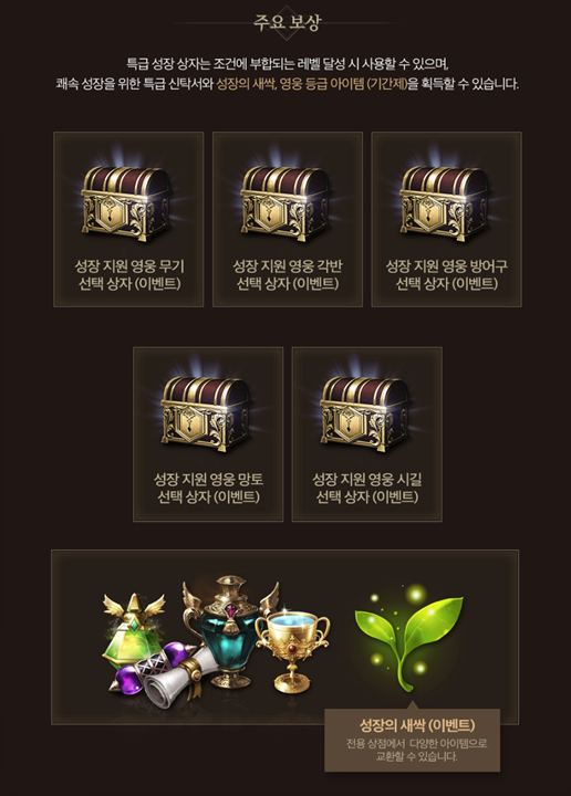 신규/복귀 특급 성장 상자에서는 다양한 영웅급 기간제 장비류를 비롯해