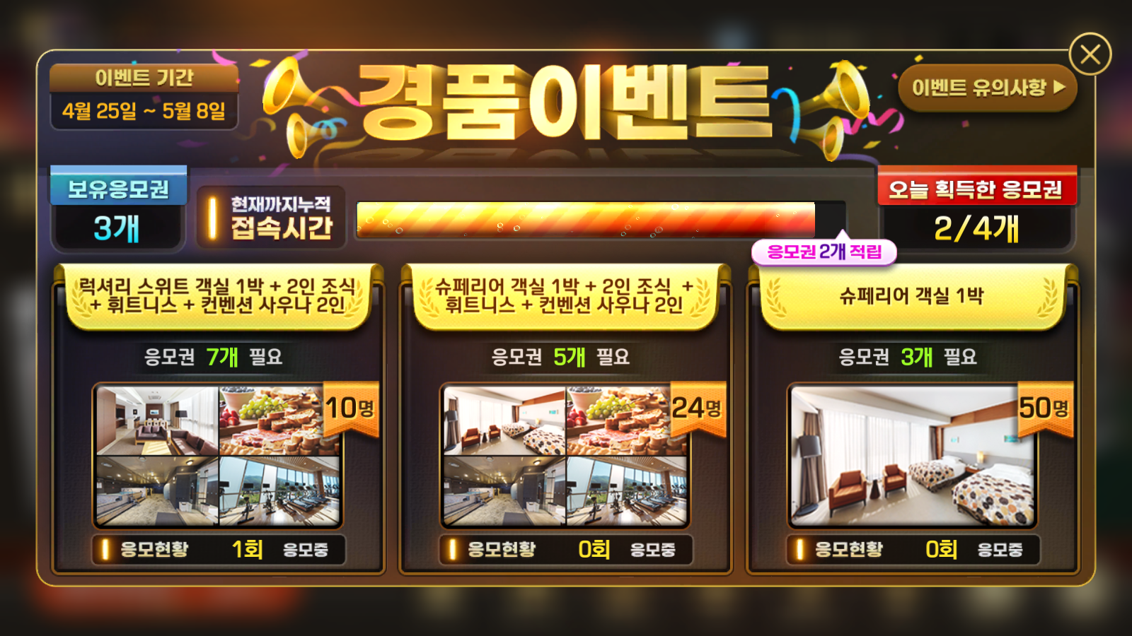 MIRATK 그냥 한번 응모해보게 되네 작성일시 : 2023. 05. 04 (11:38) 조회 : 466 / 댓글 : 0 피망뉴베가스 접속시간 누적 응모권으로 리조트 패키지 준다길래 함 접속하고 응모해보는 중ㅋㅋㅋ 하루에 응모권 네장씩 주니까 걍 밥먹거나 게임하거나 유유자적하고있음 시간 금방 찬다경쟁률 엄청 세겠지만 완전 랜덤이라 하니세개에 하나 씩 정도는 응모해보고픈 마음..ㅎㅎ 1추천 글쓰기스크랩 신고