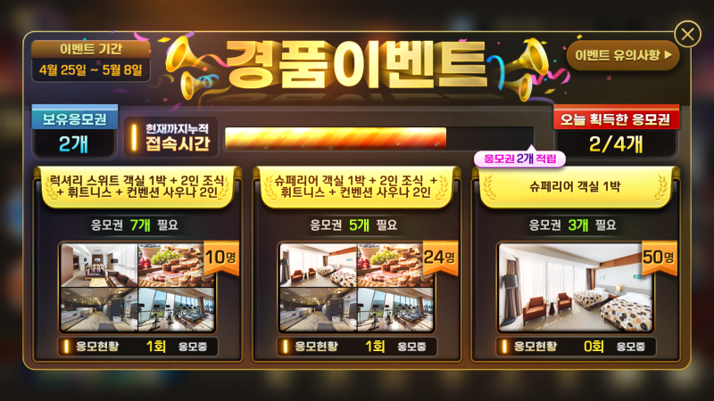 MIRATK 마지막 응모만 남았다 작성일시 : 2023. 05. 08 (12:46) 조회 : 460 / 댓글 : 0 피망뉴베가스에서 리조트 경품 이벤트 실시하는 거 오늘이 마지막!!전 저번주에 뉴스 기사를 본 덕분에 이렇게 응모에 성공했습니다ㅋㅋㅋ물론 한 번씩 밖에 안 됐지만 그냥 로또 당첨 기다리 듯이 안 되면 어쩔 수 없고 되면 이득이라는 마인드~응모권 기다리면서 간만에 바카라도 플레이 하니 재밌네요 베팅 성공해서 재밌는 건가 ㅋㅋ)하루에 응모권 4개씩 주니까 솔직히 오늘만 해서 객실 1박만 노려도 괜찮을 듯..!? 1추천 글쓰기스크랩 신고