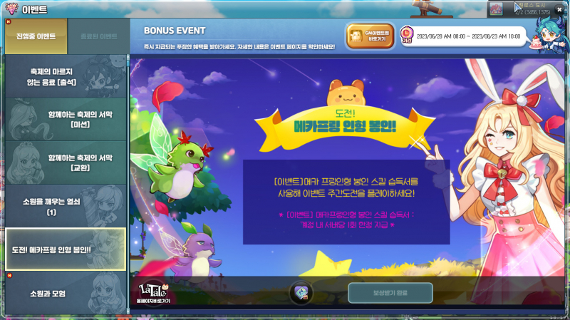 꾸쀼쀼 라테일 육성하면서 이벤트 참여 작성일시 : 2023. 07. 17 (16:13) 조회 : 405 / 댓글 : 2 라테일 지금 17주년 이벤트 하고 있는데메카프링 인형 봉인부터 차근 차근 이벤트 참여 중이거든요주간 도전 하고 있어서 그거 플레이 하면서버닝도 같이 하는 중 ㅋㅋㅋ200 레벨 이상 경험치 던전 플레이 하면장비 교환도 할 수 있다고 해서요즘은 라테일 이벤트 참여하면서 육성 같이 하고 있어요 ㅋ 1추천 글쓰기스크랩 신고