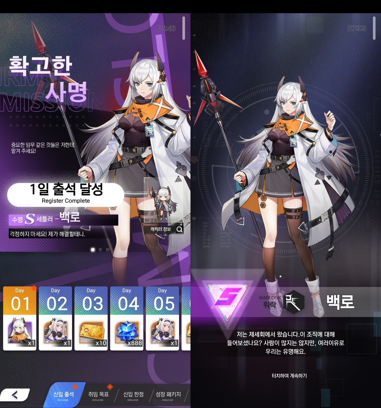 출첵 1일차부터 S급 딜러 새틀러 백로도 주고있고 이틀차에는