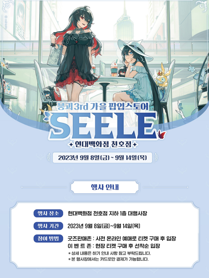 n132788823 팝업스토어 가시는분? 작성일시 : 2023. 09. 06 (20:53) 조회 : 291 / 댓글 : 0 9월 8일부터 14일까지 붕괴3rd 팝업스토어가 열린다고 합니다!장소는 현대백화점 천호점인데 아무래도 주말에 사람이 많이 몰릴것 같네요~죽음과 생명의 율자인 제레를 테마로 메인스토리 1.5부의 2개 세계인 세인트 솔트 스노우하고 사철의 나라를 체험할 수 있는데굿즈샵의 경우에는 온라인으로 예약한 사람만 입장할 수 있다고 해서 예약해놓고 기다리는 중입니당 :D 3추천 글쓰기스크랩 신고