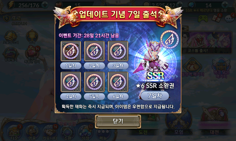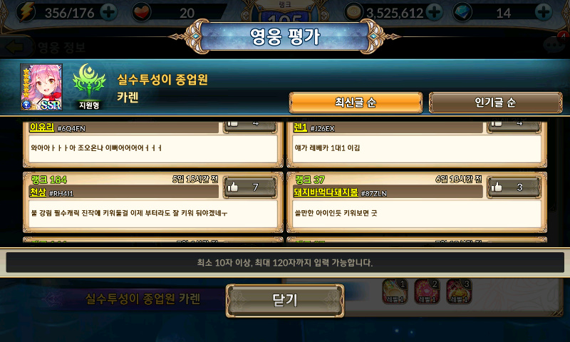 닌디 드디어 마지막 솬권!!! 작성일시 : 2018. 09. 12 (15:17) 조회 : 2,539 / 댓글 : 1 지금이 나이츠크로니클 하기에 최적의 시간입니다! 신규 업데이트로 7일 출석 이벤트 진행 중이라구욧!드디어 마지막 7일차 보상 6성 SSR 솬권 받았죠. 아싸뵹!!! 카렌 나왔어요!!없던 캐릭이 또 하나 생겼으니 키워줘야겠죵!? 영웅평가 게시판 확인해보니 불 강림 필수 캐릭이기도 하고 평가가 대체적으로 좋더군요.캐릭터가 워낙 많고 다양한 영웅으로 상황별로 팀편성을 해줘야 하기 때문에 영웅은 많으면 많을 수록 좋다는거~~수집 하는 맛으로 너무 재미있게 하고있습니당! 6추천 글쓰기스크랩 신고