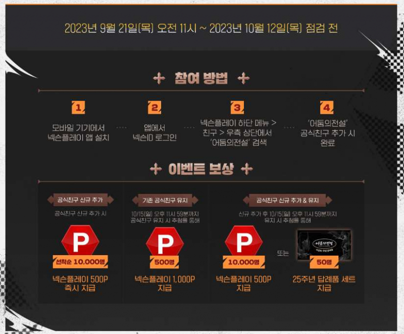 치토스 어둠의전설 3차 승급 곧 나옵니다. 작성일시 : 2023. 10. 10 (14:40) 조회 : 366 / 댓글 : 1 어둠의전설 3차 승급 업데이트 이제 딱 2일 남았습니다. 뭐 이번 3차 승급 나오면서 신규 장비, 신규 스킬, 신규 지역까지전체적으로 대규모 업데이트 예정이라 사전 등록 모집 + 사전 이벤트까지 하고 있는 중 사전 이벤트 중에서 넥슨플레이 앱으로 어둠의전설 공식 친구 추가 해두면 넥슨 플레이 포인트도 주고 추첨으로 25주년 굿즈도 준다길래 요것도 같이 해놨습니다.이제 딱 업데이트까지 이틀 남았으니 막차들 타세요 ㅋㅋ 2추천 글쓰기스크랩 신고