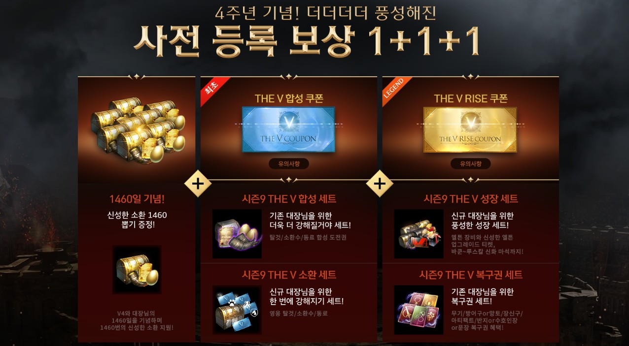 THE V 합성 쿠폰에 THE V RISE 쿠폰, 탈것이나 소환수 동료 합성을 도전해볼 수 있는 THE V 합성 세트에