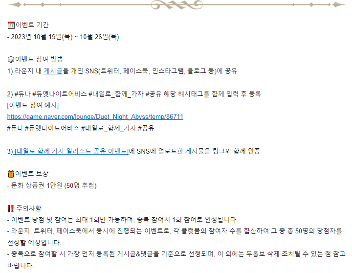 도붸르만 듀엣 나이트 어비스 일단 이벤트부터 참여중 작성일시 : 2023. 10. 24 (13:35) 조회 : 352 / 댓글 : 1 듀엣 나이트 어비스 ARPG 게임으로일러스트부터 인게임 퀄리티 공개 된 정보 보니상당한 퀄리티라 기대가 됩니다.그래서 지금 티저 페이지 열린 곳에서이벤트들 하고 있는거 다 참여하려는데일러스트 SNS에 공유 하는게 있어서 일단 이거 참여하고문상이나 노려봐야겠네요 ㅋㅋ 2추천 글쓰기스크랩 신고